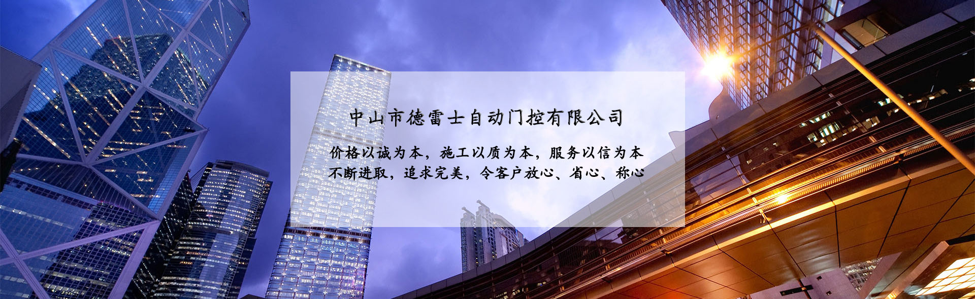 中山市德雷士自動門控有限公司代理中山松下自動門、中山松下感應(yīng)門、及其旗下品牌松下(Panasonic)自動門、旋轉(zhuǎn)門、型材門、松下門禁系統(tǒng)、地彈簧、閉門器等系列產(chǎn)品。 松下Panasonic一直致力于憑借不斷創(chuàng)新的技術(shù)營造為各個區(qū)域的用戶做出最佳解決方案,在自身領(lǐng)域處于領(lǐng)先地位;松下自動門控系統(tǒng)廣泛應(yīng)用于寫字樓、機(jī)關(guān)單位、大型企業(yè)、學(xué)校、醫(yī)院、智能小區(qū)等領(lǐng)域。在用戶心中有良好的口碑及信譽(yù)度。 松下(Panasonic)自動門控系統(tǒng)包含:自動感應(yīng)門、旋轉(zhuǎn)門、90度平開門、圓弧型門、重疊門、緊急逃生門、醫(yī)用門、氣密門、鋁合金型材門、松下門禁系統(tǒng)、家庭智能鎖、地彈簧、閉門器等系列產(chǎn)品。 德雷士自動門控有限公司從事智能門控十余載,精英匯聚;公司具有完善的管理體系,對每位客戶都進(jìn)行檔案管理,跟蹤服務(wù),定期回訪,終生維修。提供急修12小時解決,一般維修48小時解決的服務(wù),完全能解決您的后顧之憂。 公司的質(zhì)量方針 科學(xué)管理確保的工程質(zhì)量 真誠服務(wù)贏得客戶信譽(yù) 持續(xù)創(chuàng)新打造企業(yè) 公司的服務(wù)宗旨 價格以誠為本,施工以質(zhì)為本,服務(wù)以信為本。 實實在在做人,老老實實做事,以我們的辛苦換來客戶滿意的微笑,這就是我們的追求! 公司的目標(biāo) ...